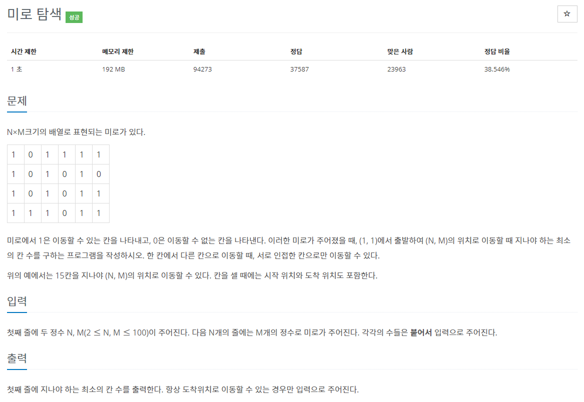 첫째 줄에 두 정수 N, M(2 ≤ N, M ≤ 100)이 주어진다. 다음 N개의 줄에는 M개의 정수로 미로가 주어진다. 각각의 수들은 붙어서 입력으로 주어진다.
