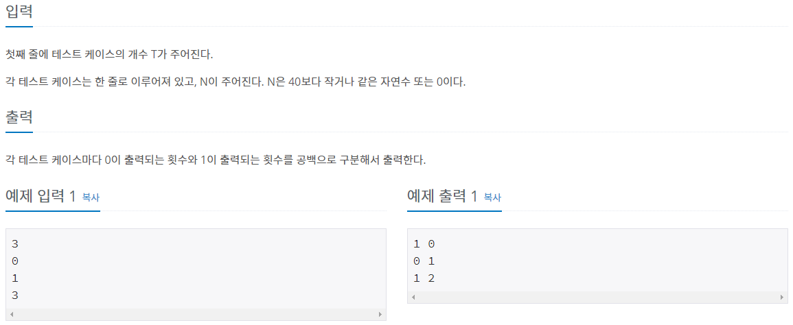 각 테스트 케이스마다 0이 출력되는 횟수와 1이 출력되는 횟수를 공백으로 구분해서 출력한다.