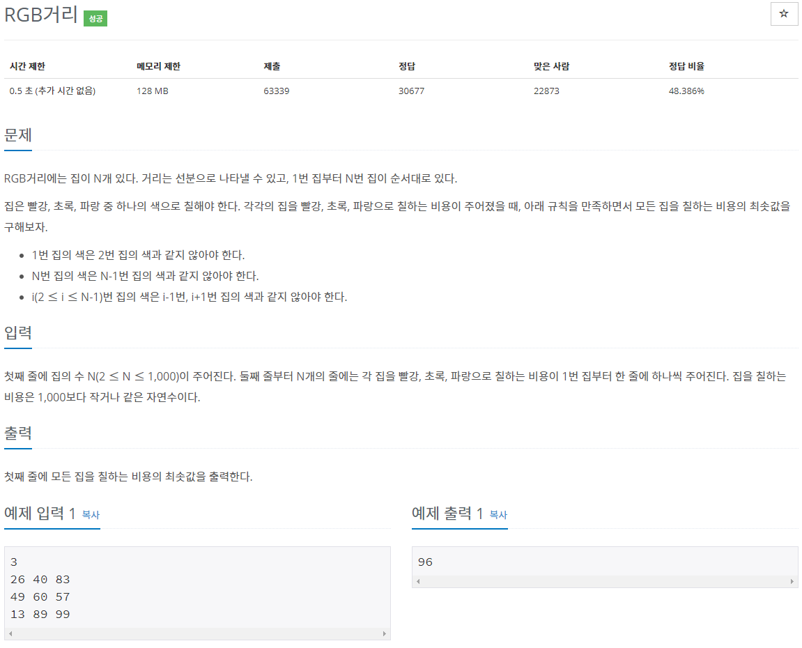 이 문제는 동적프로그래밍을 이용하여 풀었습니다. 결과값이 빨강 초록 파랑으로 각각 result[i][0] result[i][1] result[i][2]로 만들어서 빨강의 결과값 = 이전 초록, 파랑 결과값중 작은거 + 자기자신의 빨강으로 계속 결과값을 도출해내면 됩니다.