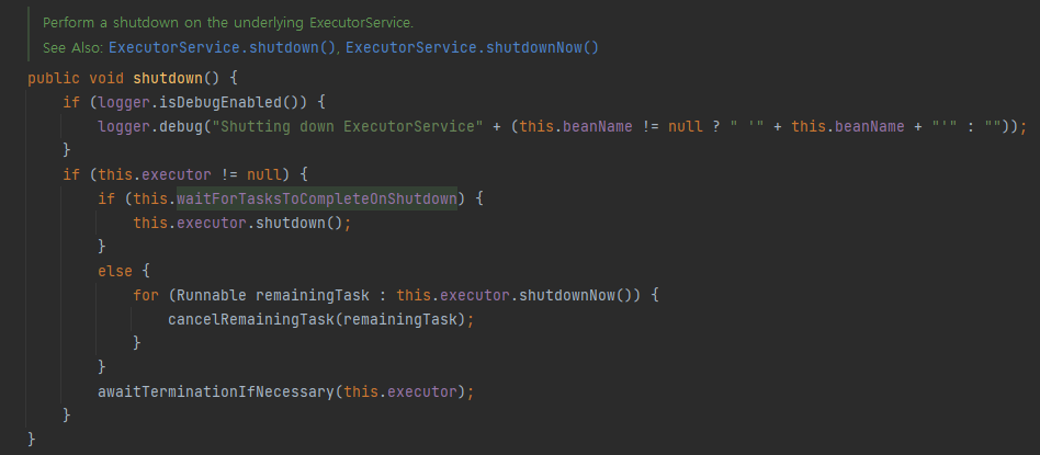 그러나 여기에는 또 다른 함정이 있습니다. servicLogic() 부분에서 오랜 시간이 걸려 강제종료하면 종료가 되지 않았습니다. 그래서 ThreadPoolTaskScheduler의 shutdown()메소드를 살펴보았습니다.