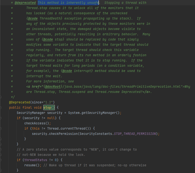 Thread는 destroy() , stop() 메소드 대신 interrupt를 일으켜 사용중지 할것을 권하고 있습니다.