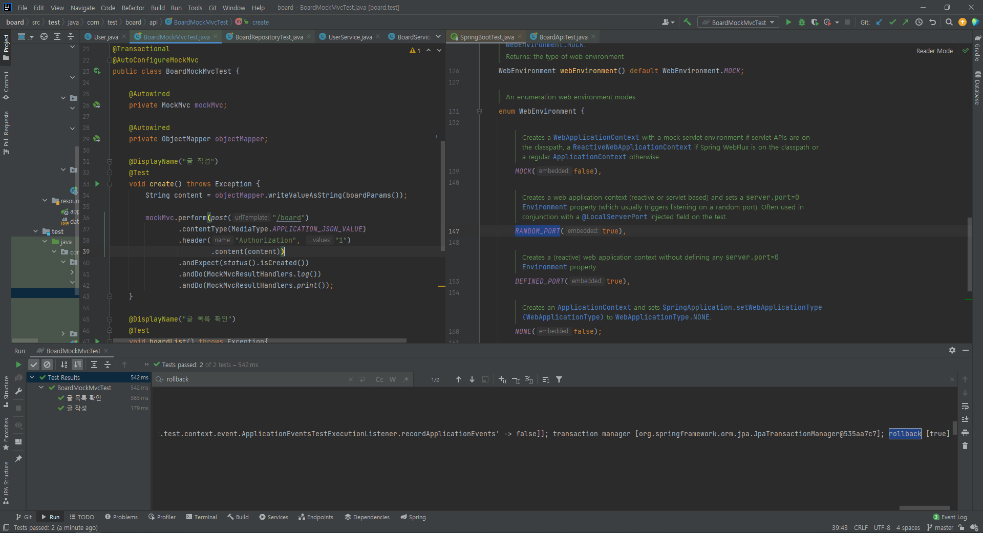 더 알아보니 WebEnvironment.RANDOM_PORT는 롤백이 안될 수 있다고 하여 직접 테스트 해보았습니다.