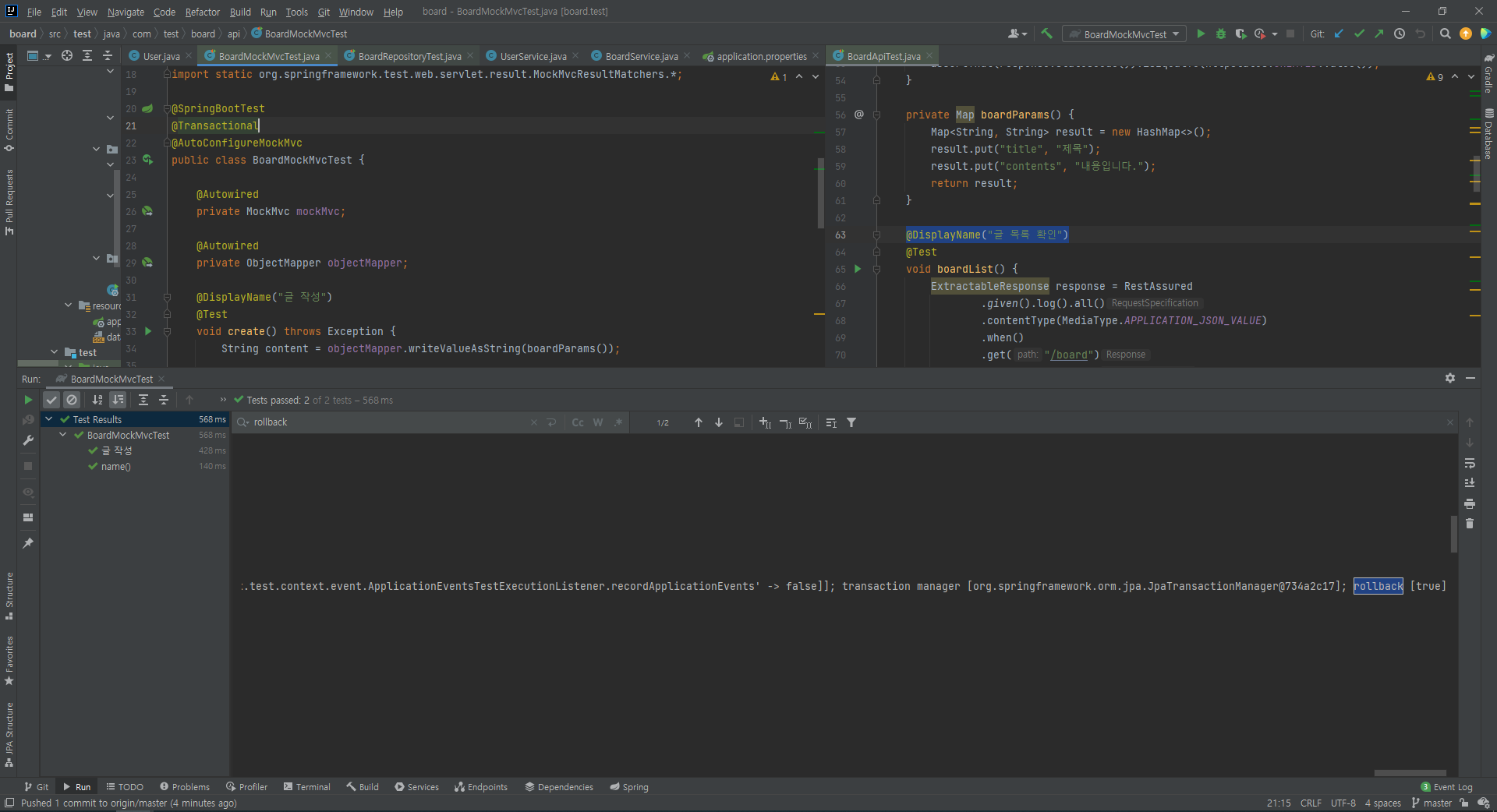 열심히 springboottest 코드를 짜는 와중에 @DataJpaTest처럼 @Transactional rollback이 자동으로 되는줄 알았습니다..