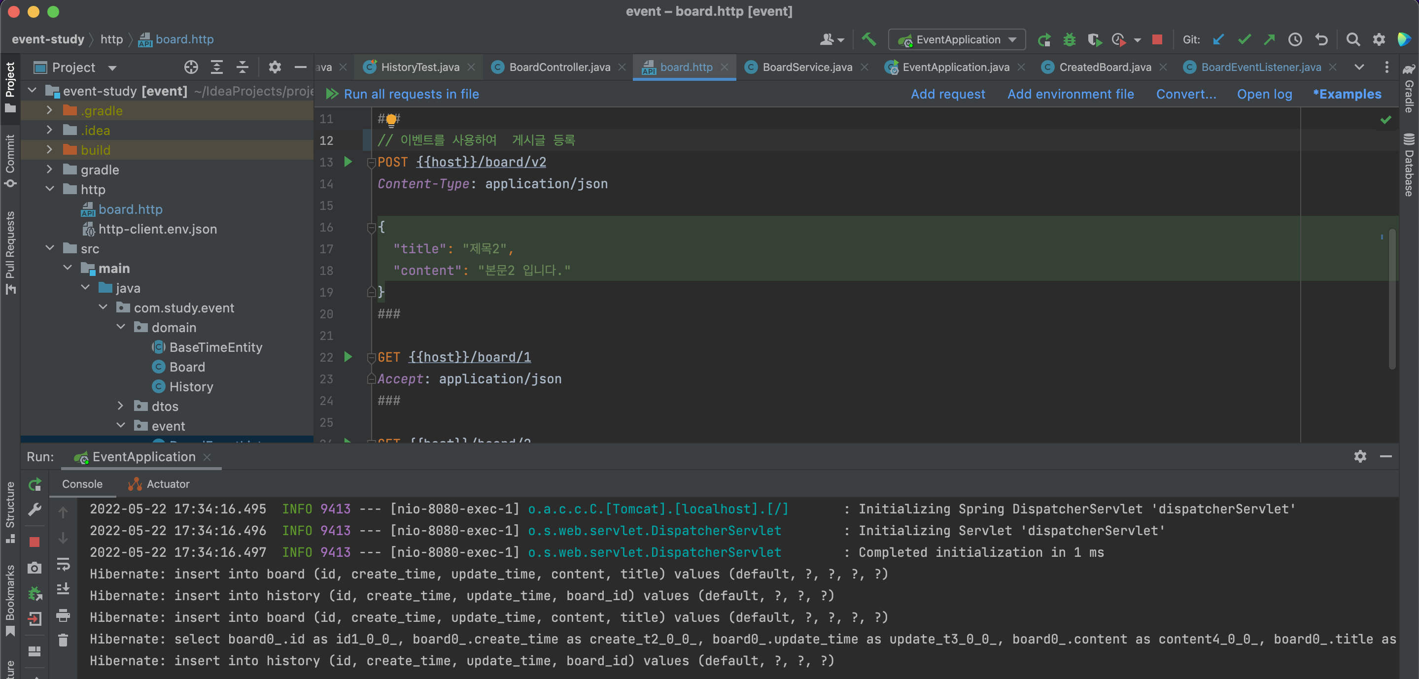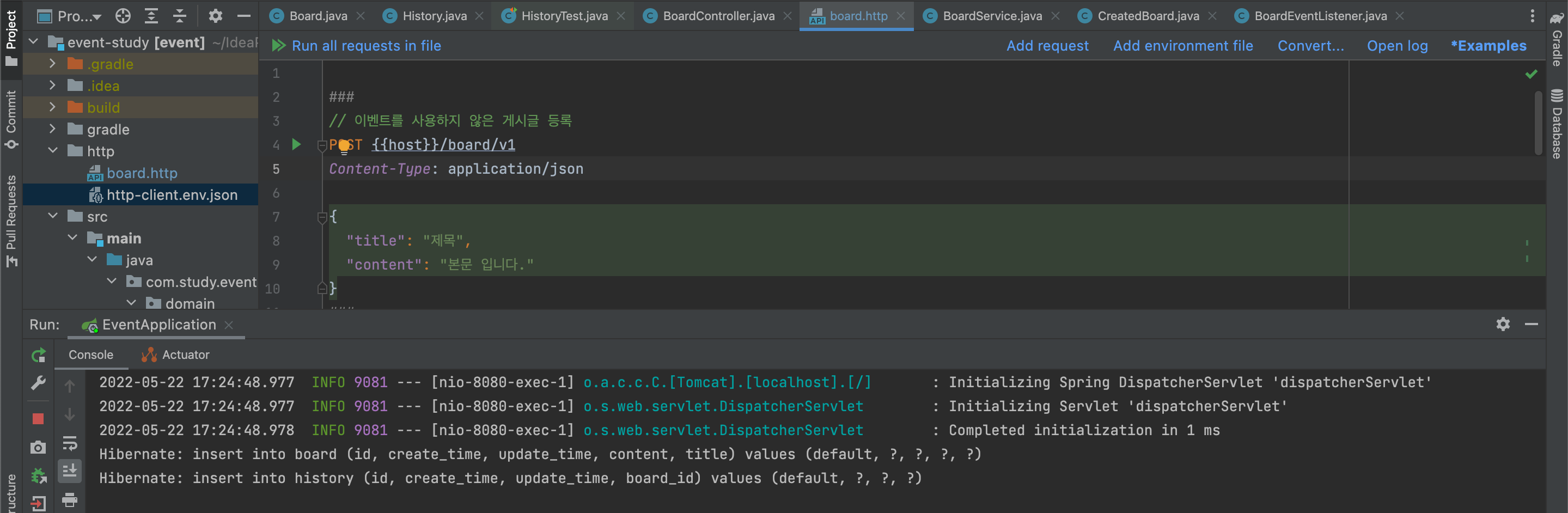 BoardService에서 historyRepository를 이용하여 이력을 등록하였습니다.