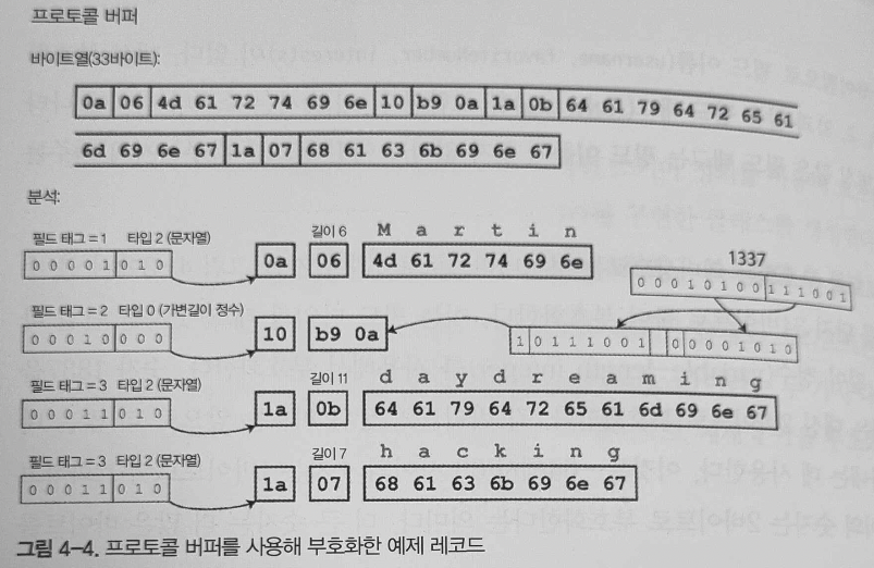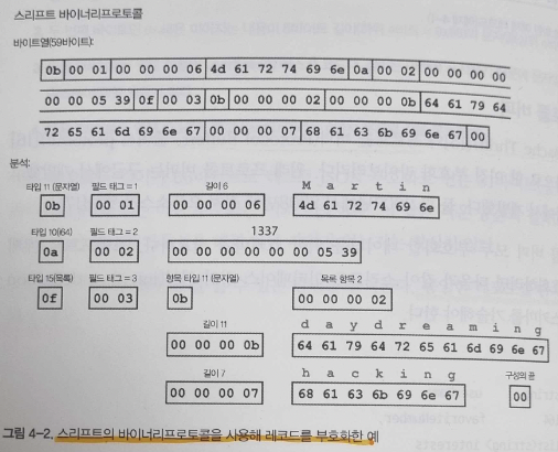 바이너리 프로토콜의 경우 각 필드는 타입, 필드 태그(인덱스), 데이터 길이, 값의 바이트로 되어있다.