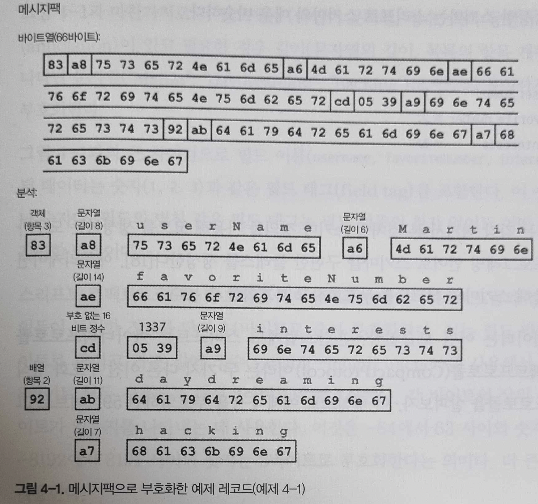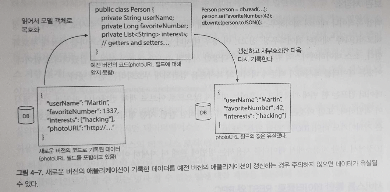 - 상위호환성: 이전 코드가 새로운 코드에서 기록한 데이터를 읽을 수 있어야 함(새로 추가된 필드는 못읽겠지만 적어도 읽는 데 오류가 없어야 함)
