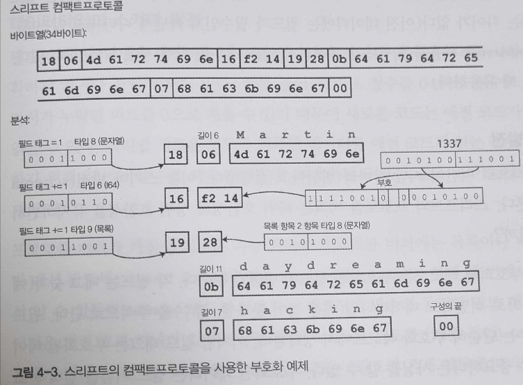비트를 줄이고 저장하는 처리 방식은 약간 다르지만 부호화된 데이터를 보면 컴팩트 프로토콜과 비슷하다.