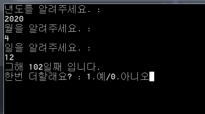 Console.WriteLine("그해 " + dayofYear(year, month, day) + "일째 입니다.");