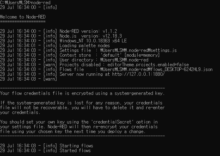 Node-Red 실행 간단합니다. cmd창에 node-red 명령어를 실행하면 끝!