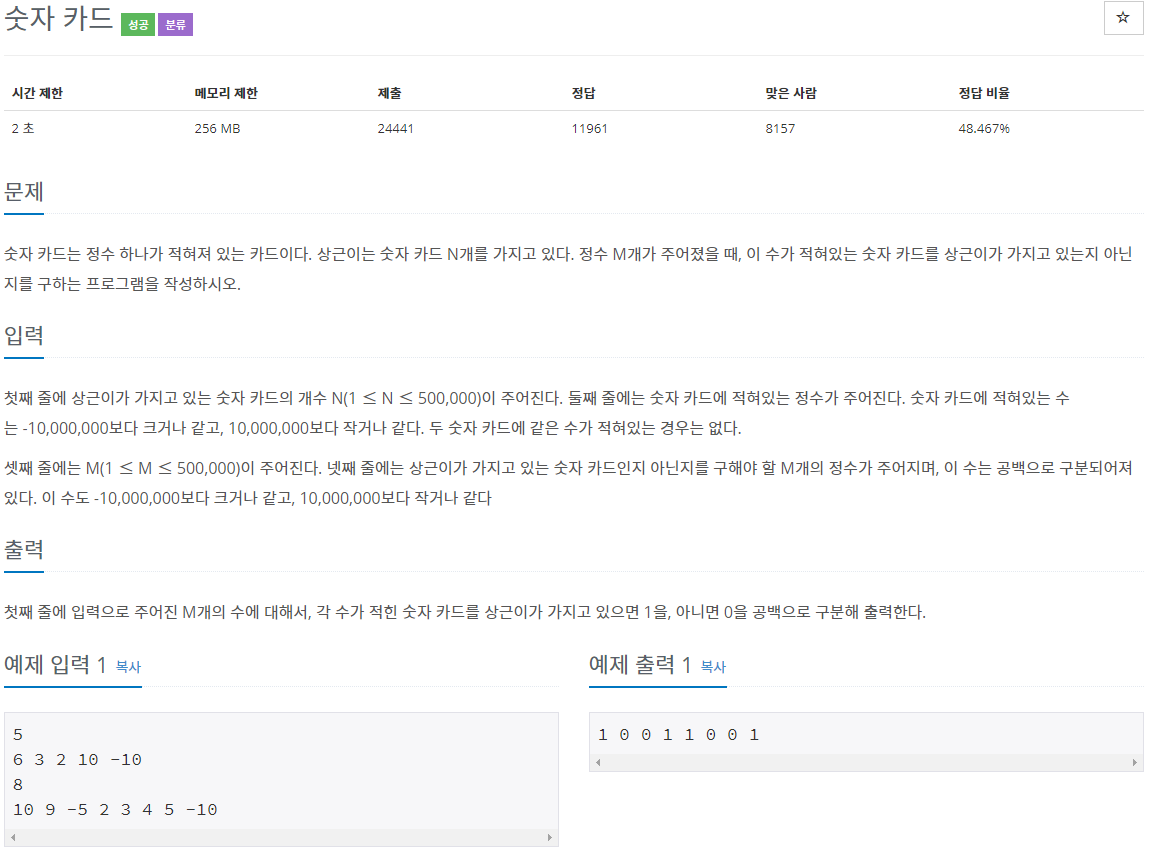 * 이 수가 적혀있는 숫자 카드를 상근이가 가지고 있는지 아닌지를 구하는 프로그램을 작성하시오.