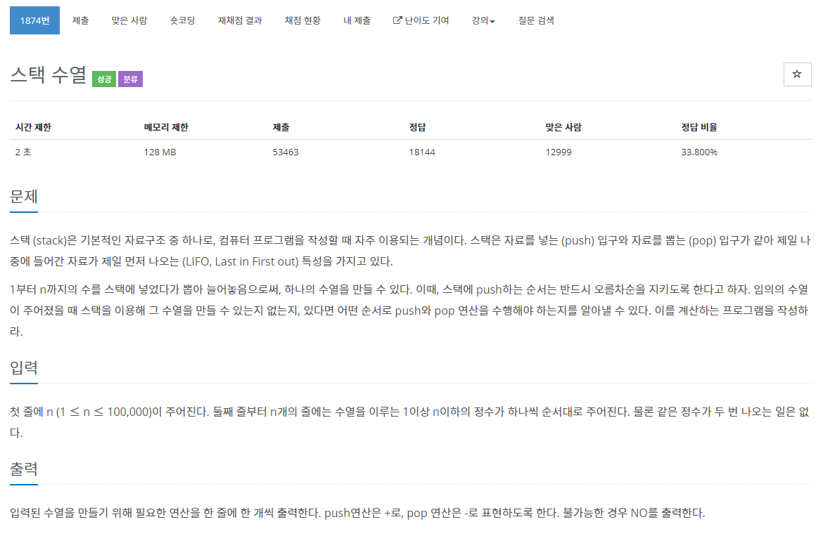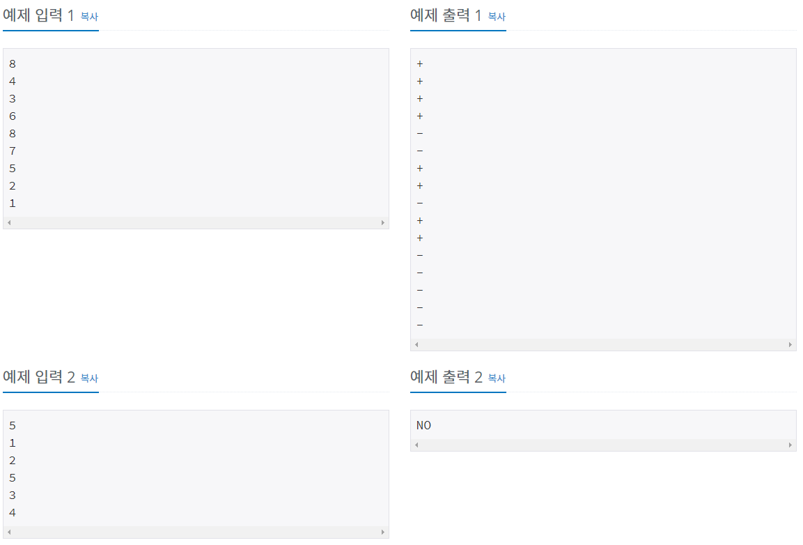 입력 받은 값을 스택에 넣었고 결과 스택에 추가하여 수열을 만들었습니다.