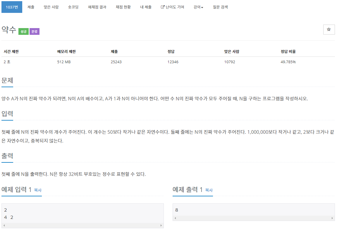 풀이 : 약수가 주어질때 최대값과 최소값을 곱하면 양수A가 나온다 로 풀이하였습니다.
