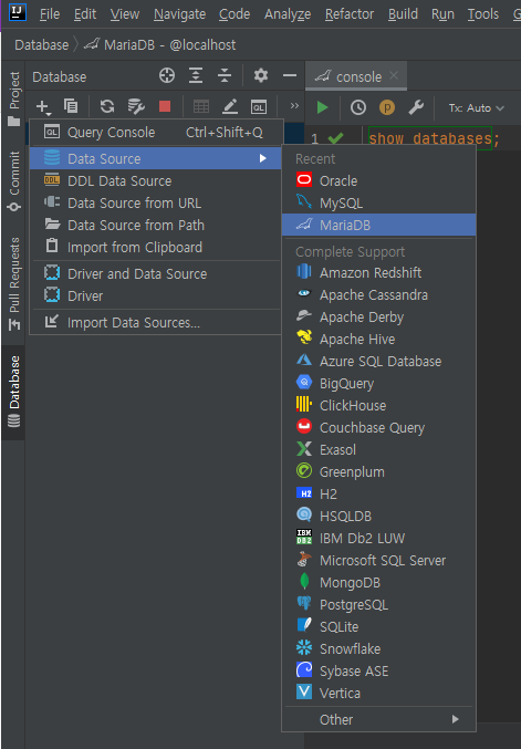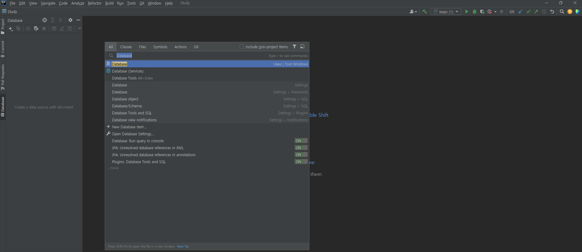 Database탭이 보이지 않으면 Ctrl+Shift+a 를 누른후 Database 를 검색 클릭해 주세요.