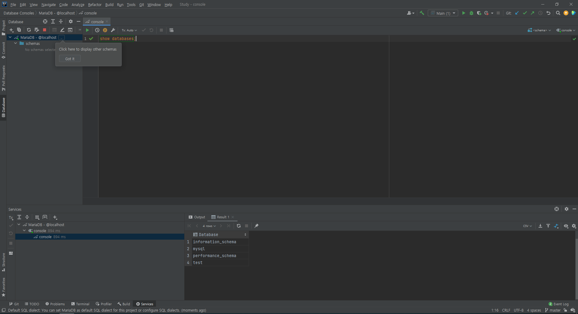 show databases; 를 입력 후 실행을 시키면 접속 완료됩니다.