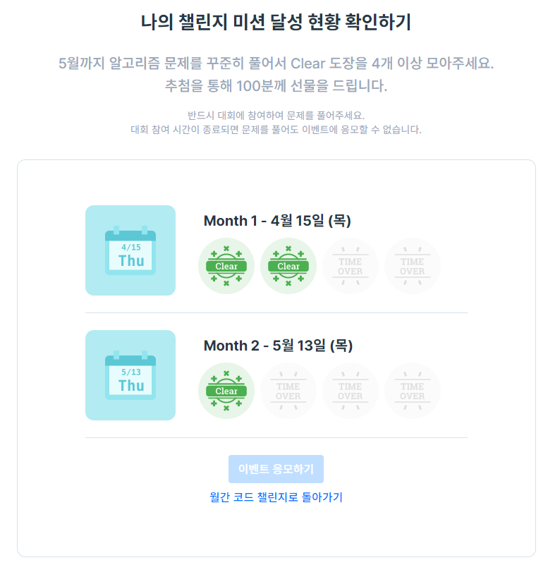 다음엔 4문제 이상 풀어서 이벤트 응모도 할 수 있게 하고 알고리즘 공부를 더 열심히 해야겠습니다. 이번 챌린지에서 풀었던 문제는 포스팅 하여 올리겠습니다. 감사합니다.
